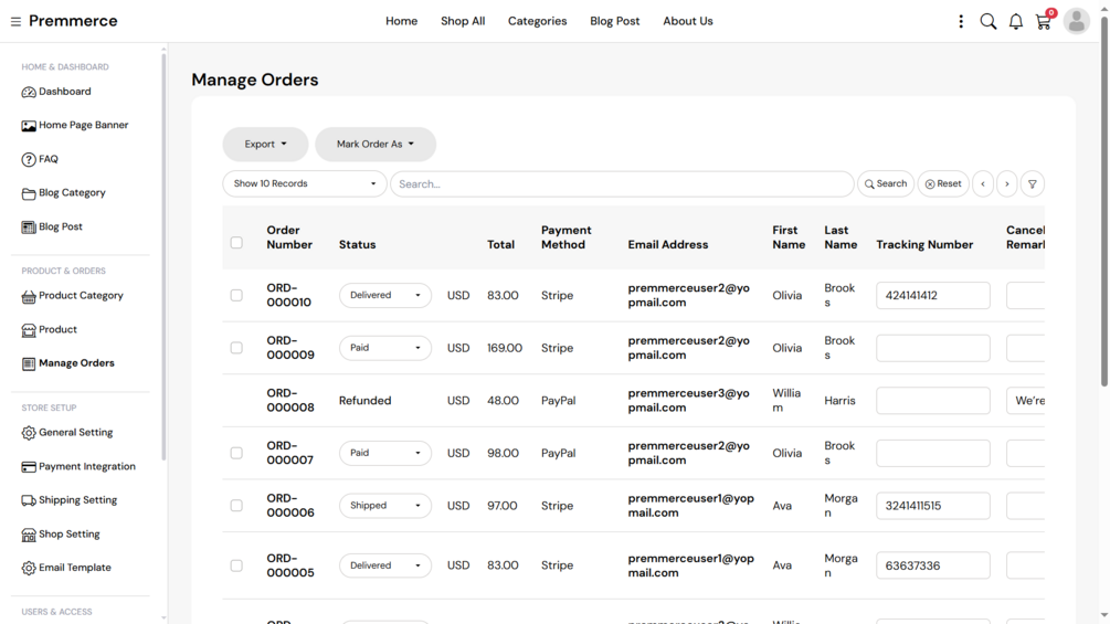 - When the order status is changed to refunded, the refund will be initiated via Stripe or PayPal (based on which payment method the customer used for the order).