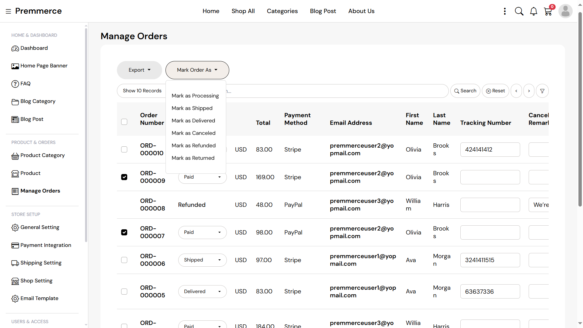 - When the order status is changed to refunded, the refund will be initiated via Stripe or PayPal (based on which payment method the customer used for the order).